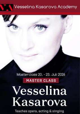 Aktive Teilnahme - Platz beschränkt Täglicher Einzelunterricht à 40 Minuten Gesangunterricht mit Schwerpunkt Technik und Interpretation bei der international bekannten Mezzosopranistin.Vesselina Kasarova zählt zu den bedeutendsten und vielseitigsten Sängerinnen der Gegenwart. Ihre Weltkarriere verdankt sie nicht allein ihrer phänomenalen Stimme, sondern ebenso ihrer charismatischen Persönlichkeit. Obwohl erfolgsverwöhnt, hat sie den Sängerberuf immer wieder kritisch reflektiert. Sie ist eine Künstlerin, die nicht nur etwas zu erzählen, sondern etwas zu sagen hat.Arienbegleitung durch Pianisten.Öffentliches Abschlusskonzert |